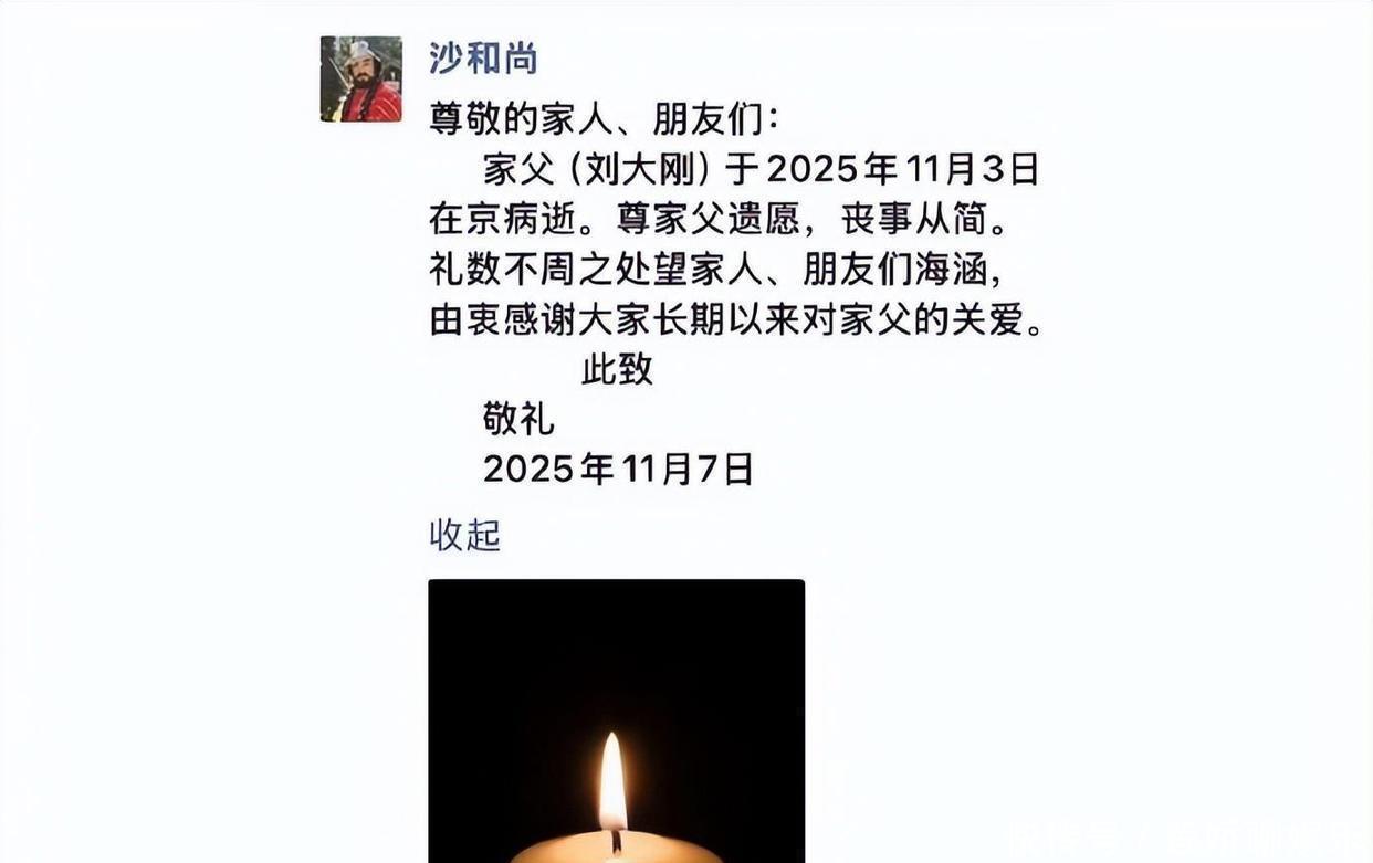 家属在他的酬酢平台上发布的讣告,技能是11月7日,实践苟简是:家父(刘大刚)于2025年11月3日在北京逝世,依照他的遗志,凶事简办,礼节若有不到之处,还请家东谈主一又友多多见谅。