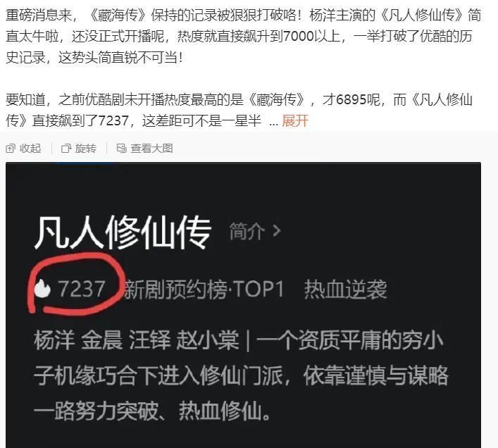 《藏海传》还未开播的技术,热度达到6895,是酷的剧未开播的最高热度,但《凡东谈主修仙传》奏凯飙升到7237,奏凯冲突之前《藏海传》创下的记录,这部剧开播后,口碑和热度是可以的,很有可能会出现凌霜傲雪的情况。