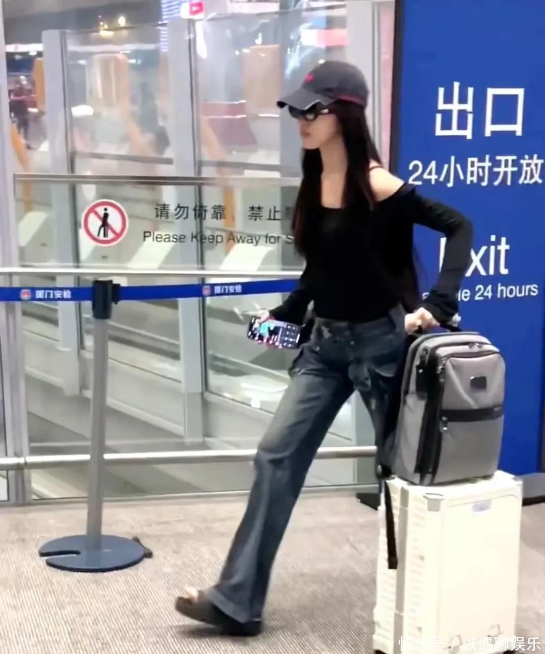 小苹果走终末,戴个棒球帽和墨镜,黑露肩上衣配牛仔裤,看着比同龄小姐显气质。